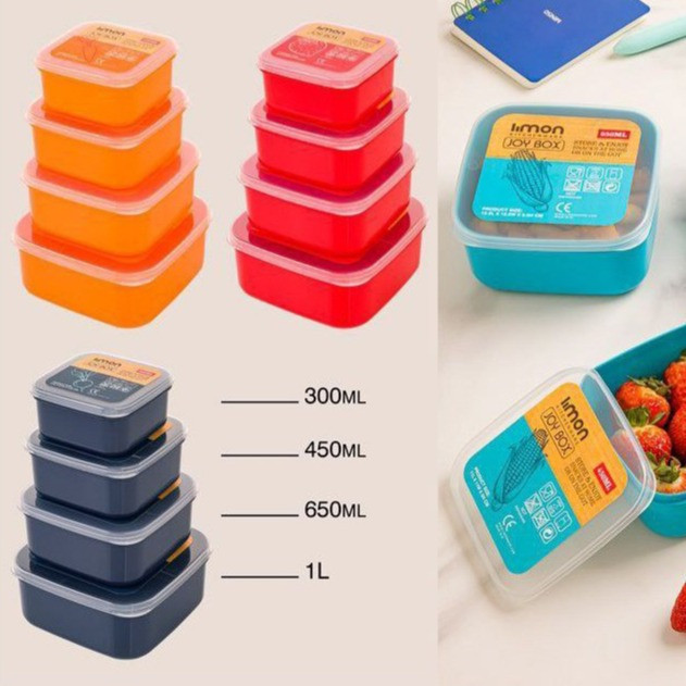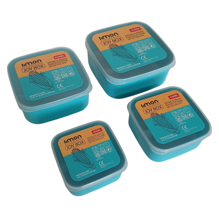 ظرف غذای مربعی لیمون که چهار رنگ نارنجی ، قرمز ، فیروزهای و سورمهای تولید شده و این ست شامل چهار ظرف به حجم ۱۰۰۰ میلی لیتر ، ۶۵۰ میلی لیتر ، ۴۵۰ میلی لیتر و ۳۰۰ میلی لیتر میباشد . در این ظرف واشر نداشته و قابلیت نگهداری دمای غذا به مدت زیاد را ندارد ، همچنین این ظرف قابلیت استفاده در ماکروویو و ماشین ظرف شویی را ندارد . سایز بزرگ این ظرف مناسب تغذیه کودک بوده و سایز های کوچک آن را میتوان با عنوان باکس همراه در کیف استفاده کرد